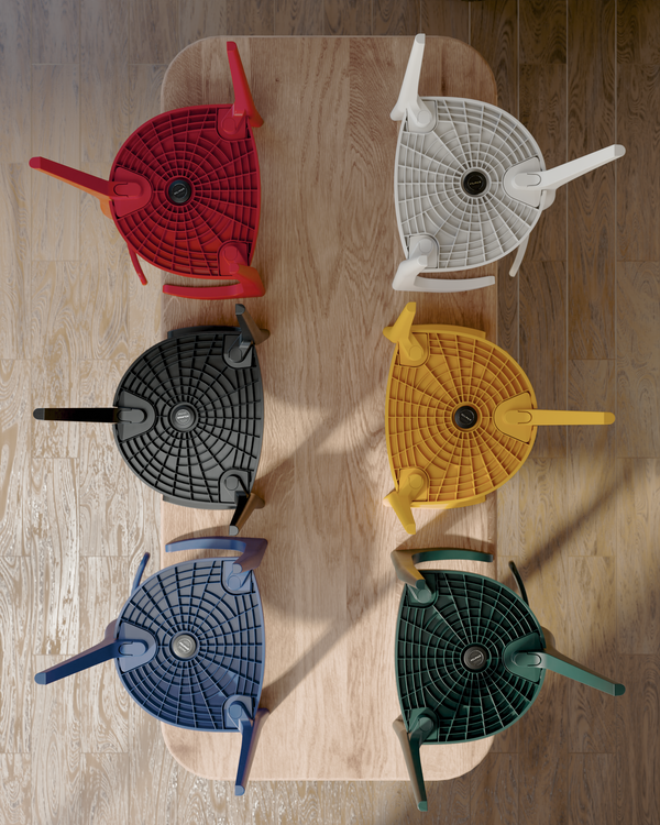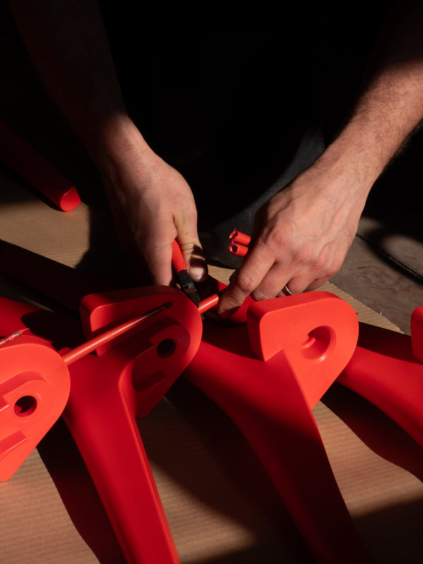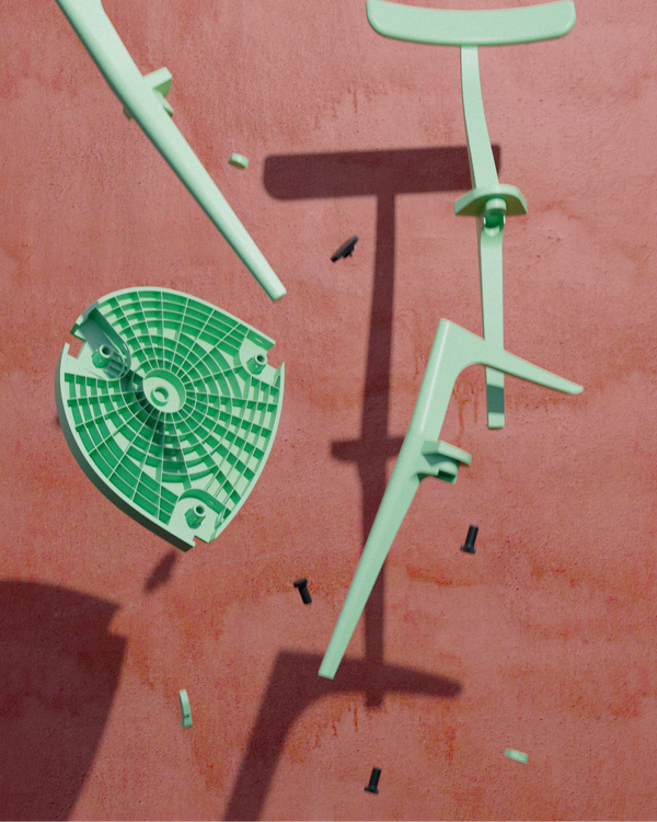 Nous n'utilisons aucun plastique neuf et tous nos meubles sont assemblés sans vis en acier, sans colles, sans bois… En bref, aucune autre matière qui complexifierait l’étape de tri. Nous sommes les premiers à proposer un système d'assemblage réversible en 100% plastique recyclé, et nous en sommes fiers.